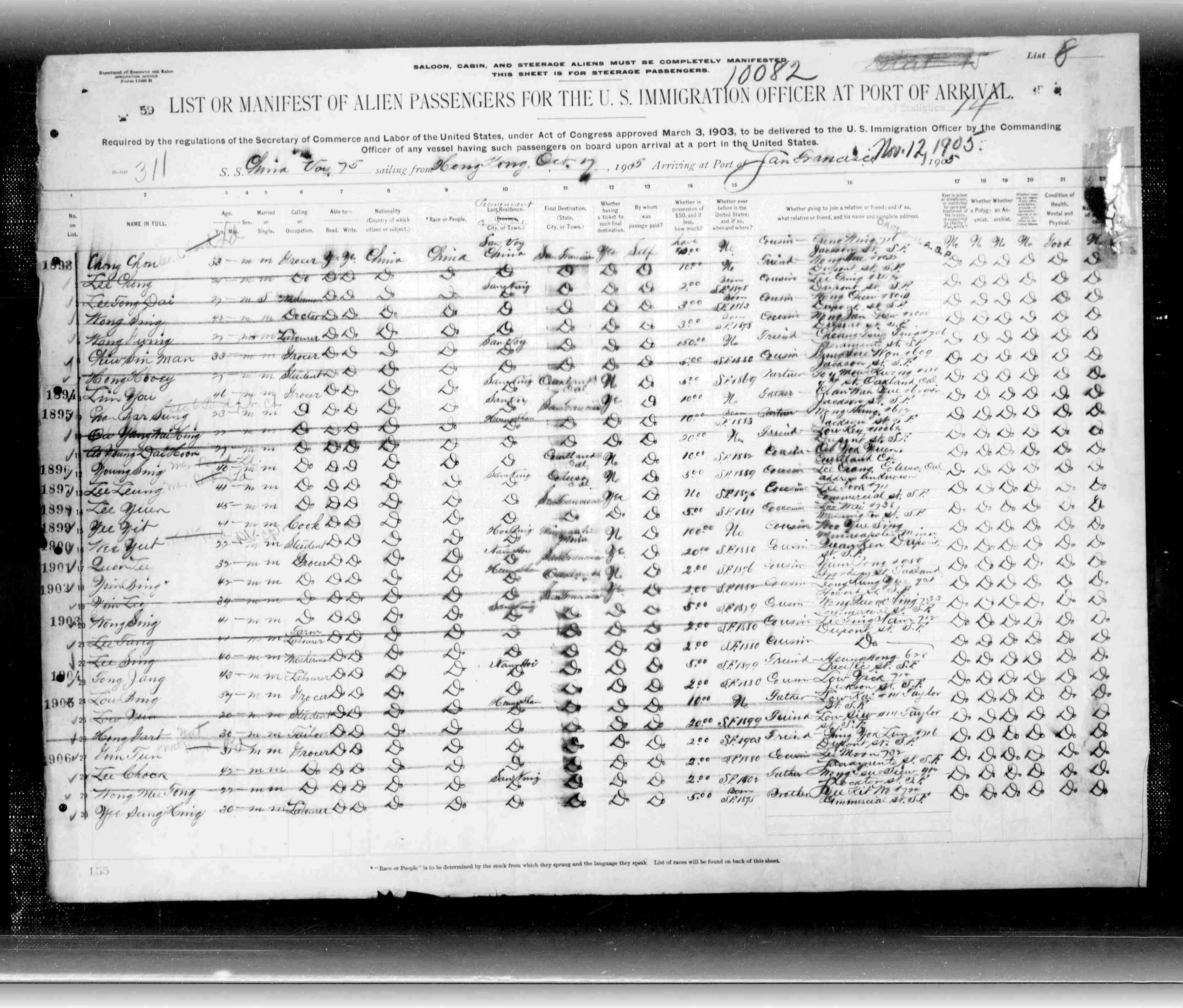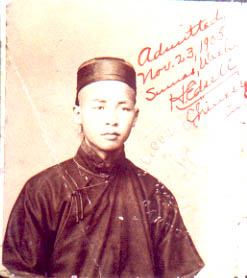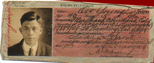 Hoon Owyang first arrived in North America on November 8, 1905, arriving in Vancouver, British Columbia on the S.S. Empress of China. Interestingly enough, our fifth cousin and genealogy researcher Michael Ho found a ship log with Hoon Owyang's name on it for the Empress of China's landing in San Francisco on November 12, 1905, with Hoon Owyang's name crossed out. He must have originally planned to sail to San Francisco but possibly talked to other passengers and decided to disembark in Vancouver. Historian Erika Lee, in her excellent At America's Gates: Chinese Immigration during the Exclusion Era, 1882-1943, writes about how many Chinese immigrants came into the U.S. through Canada because the immigration service was far less strict than in San Francisco. Hoon Owyang then took the Canadian Pacific Railway to Sumas, Washington, where on November 18, he applied to land in the United States as a Chinese merchant of Yau Lan Moon, Canton (now romanized as Guangzhou). He presented a Certificate for Merchant, which verified his merchant status (because of the Chinese Exclusion Act, from 1882 to 1943 Chinese laborers were not allowed to immigrate to the U.S.; only merchants and other professionals, and their spouses and children were allowed). According to the GSA website, Twenty-four border stations were soon established including the earliest U.S. Customs House in Washington State which was located in a rented building at the Port Sumas in 1891. (Sumas, 20 miles inland from Semiahmoo in Whatcom County, was the meeting point of the Canadian/U.S. rail traffic. It was designated as a Chinese Port of Entry for immigrants coming by ship to Vancouver and then to mining and logging camps in the northwestern U.S.) Hoon Owyang said that he went to school until he was twenty years old, then ran a business, the Mow Wah Company, for three years in Heong Shan (1899-1901, now Zhongshan) where he sold Chinese merchandise. Then he went to Canton (now Guangzhou), and helped run a business called the Yee Lee Company, located on Yan Lan Moon Street. He had a $2,000 interest in this firm, which had $8,000 in capital. In the order admitting Hoon Owyang (the order spelled his name Ao Yong Dai Hoon), inspector in charge H. Edsell noted, "He has been carefully examined as to his former occupation, his financial standing and his intention of admitted to the United States...He offers substantial evidence of his financial standing [he had presented a bank draft for $1,000 and $100 in gold and paper money], and examination of his hands and person indicate that he has never engaged in manual labor. He is therefore admitted." The 1905 photograph that was on the certificate is at left. Click here to see the entire certificate, approximately 3' by 2' unfolded, as it is in the National Archives branch in San Bruno, CA. It had been folded many times and was quite worn, as if Hoon Owyang had to carry it in his pocket all the time. He was admitted to the United States on November 23, 1905, at the age of 27. According to his testimony before a return trip to China in 1916, Hoon Owyang first made his headquarters with the Sang Wah Sang Co. on Jackson Street in San Francisco and shortly after made his way to Courtland, California, looking for business. He "did not find anything to do" and returned to Sang Wah Sang and stayed there until 1907, when he became a member of the firm of Dock Sang Wah Company, also on Jackson Street. Within a year, the company went out of business. In 1909 he became a partner in the Hung Lee Shee store with nine other men. See a guide to the complete records at this page. Hoon Owyang joined the Kwong Chong Chan firm when it organized on November 21, 1911. He worked as a general helper and according to his daughter Louise, also bought and sold fish, caught by local fisherman on the Sacramento River. He also was the calligrapher for the firm and for other community buildings; daughter Louise Owyang and nephew Tommy Sue remember helping him carve the characters once he had drawn them. The Chan family, descendants of other original Kwong Chong Chan partners, currently owns the building where the store was located and was kind enough to give us a tour in 2005. Some of the aunties in the Chan family remember Hoon Owyang well, saying he kept the books for the business and taught them how to use the abacus. Visit this page to see photographs of the store and his calligraphy that remains to this day. In 1916, Hoon Owyang returned to China, where he married Gee Chew Lin (also spelled as Chiu Chew Lin) and then returned to Courtland in 1919. This is Hoon Owyang's Certificate of Identity from when he came back to the United States on February 9, 1919. The interrogation records can be viewed at this site. Gee Chew Lin Owyang's photograph from when she came to the United States February 9, 1919 is on the left. Questions on Angel Island Because he had arrived earlier and had merchant status, Hoon Owyang had a relatively easy time when he returned in 1919. His wife Gee Chew Lin was asked more questions, as the authorities sought to verify that she was indeed the wife of Hoon Owyang. According to her answers to questions upon her arrival in Angel Island on September 2, 1919 at the age of 34, Gee Chew Lin and Hoon Owyang were married on April 21, 1917. She said that she did not know him until they got married. She said that they had a child in 1918 who died in February, 1919. The Chinese family tree says his name was Yung Son. She also said that she had been married before, to Chan Gay Sung, until he died in Jung Gar Bin village in 1915. They did not have any children. Both before he left for China and upon his arrival again in 1919, Hoon Owyang said he had a child by a previous marriage to Jee Shee, who died on January 15, 1916. They allegedly had one child, Ow Yong Dung Wah, born June 28, 1901, who arrived in the U.S. with Gee Chew Lin Owyang. Dung Wah was a "paper son" and not a real son - he actually was Hoon Owyang'